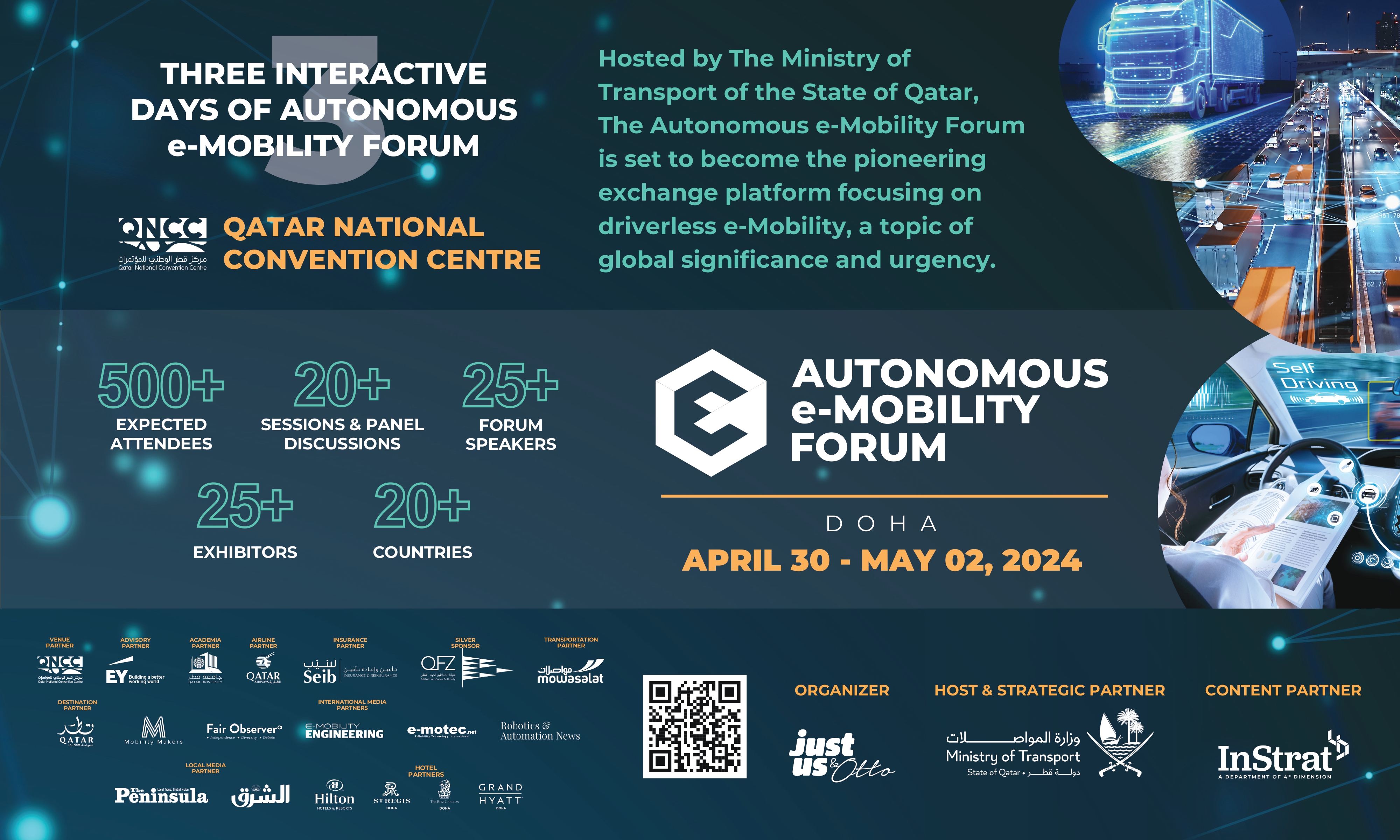 DOHA, QATAR, February 26, 2024 /EINPresswire.com/ -- Qatar is gearing up to host the Autonomous e-Mobility Forum (AEMOB), a pioneering event scheduled from April 30 to May 2, 2024. Under the patronage of His Excellency, Jassim Saif Ahmed Al Sulaiti, Minister of Transport, and hosted by the strategic partner, Ministry of Transport of the State of Qatar, the three-day forum is set to provide a multilateral exchange platform to advance the landscape of autonomous e-Mobility, a topic of global significance and urgency.The AEMOB Forum is bringing together an international expert audience of more than 500 senior government officials, sustainability bodies, academic, technology, and industry leaders to foster positive collaboration across sectors.
